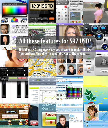 We never use any third-party software, we develop everything ourselves. The vast majority of the companies will offer you a third party video chat, a third party voip phone, a third party forum, etc. What does it mean to you? It means you will have to pay more license fees and what is very probable you will NOT have an unbranded solution. Your site will be full of logos of very different developers.It is not the case with ABK. We offer a video chat made by us, a 3d city made by us, a VOIP phone made by us, a flash profile made by us, etc. What does it mean to you? It's your site. Period. No encrypted files. No powered by's. It is your site.